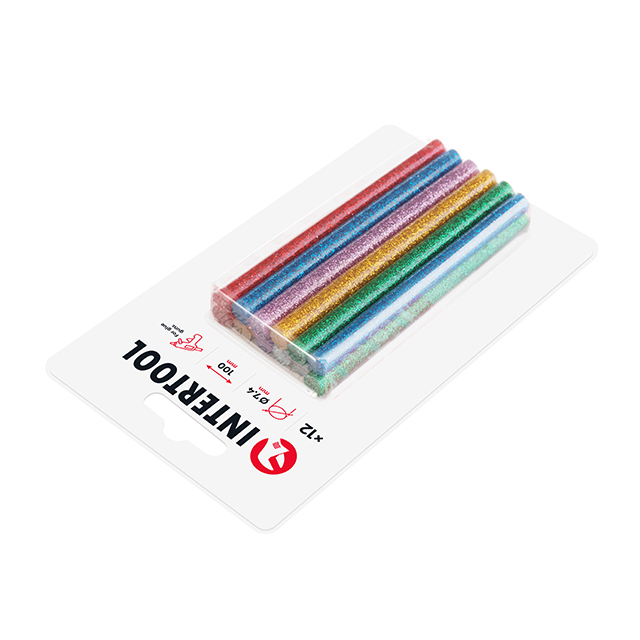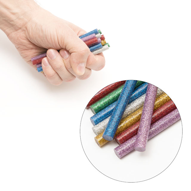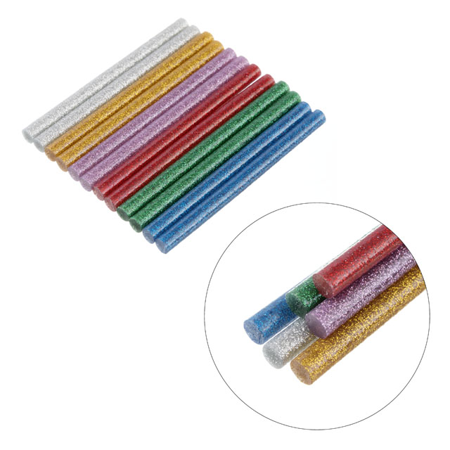 Кольорові клейові стержні з блискітками, в комплекті 6 кольорів: срібло, золото, червоний, бузковий, зелений, синій. Діаметр стрижня 7,4 мм - один із найпоширеніших і найпопулярніших розмірів, підходить до будь-яких марок клейових пістолетів. Сам стрижень довжиною 100 мм, в упаковці - 12 штук.