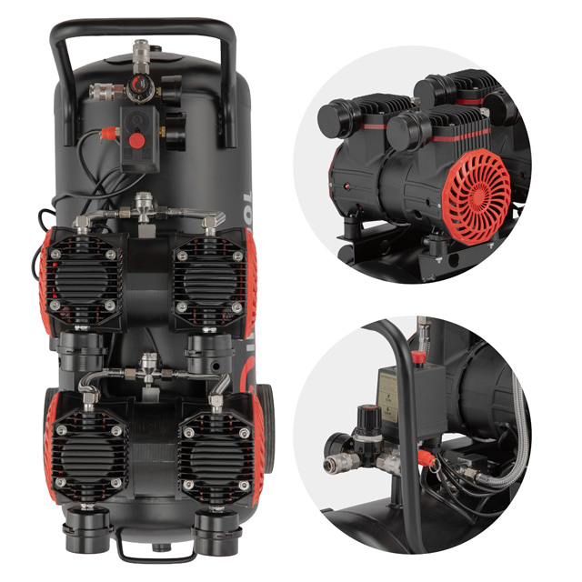 Безмасляний компресор з чотирма робочими циліндрами, потужністю 2х1500 Вт, забезпечує стабільну подачу повітря без масляних домішок, це робить його безпечним для застосування у найвідповідальніших сферах. Підходить як для побутового, так і для професійного використання: у медичній та стоматологічній практиці, харчовій промисловості, майстернях, а також вдома. Живлення від стандартної мережі 220 В дозволяє користуватися компресором у будь-якому зручному місці - вдома, в гаражі, на виробництві або в сервісі.