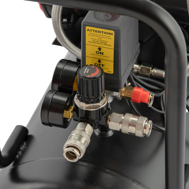 Для регулювання тиску в ресивері та на виході встановлені два манометри з редуктором, що дозволяє регулювати та постійно підтримувати вихідний тиск необхідний вашому інструменту або обладнанню.