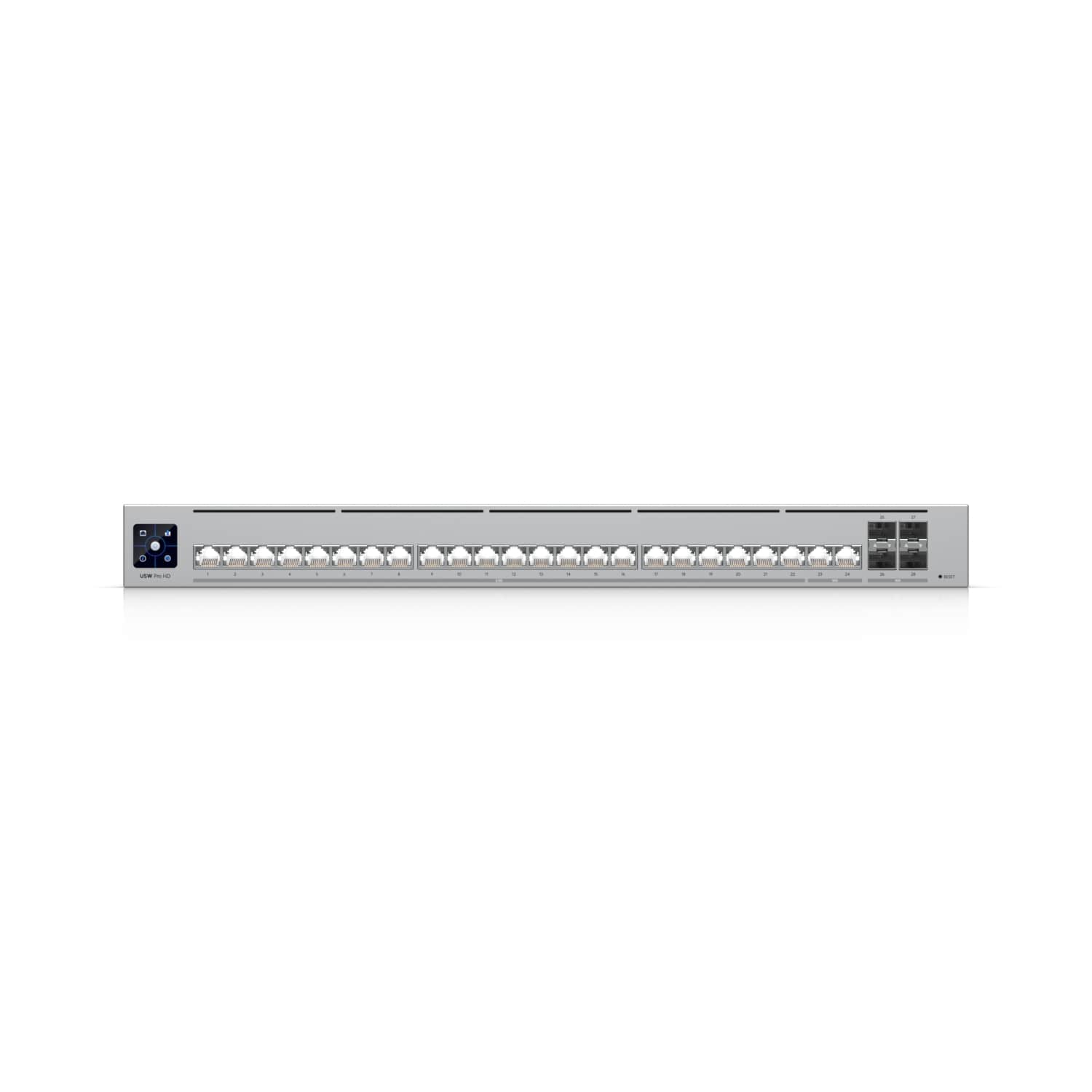 Ubiquiti UniFi Switch Pro HD 24 (USW-Pro-HD-24) – це 24-портовий комутатор PoE з функціональністю L3. Комутатор оснащений 22 портами 2,5 Гбіт/с та 2 портами 10 Гбіт/с. Крім того, комутатор оснащений 4 портами SFP+ та підтримує резервне живлення через систему резервного живлення Ubiquiti UniFi SmartPower (USP-RPS).