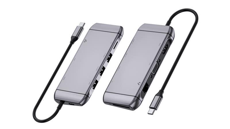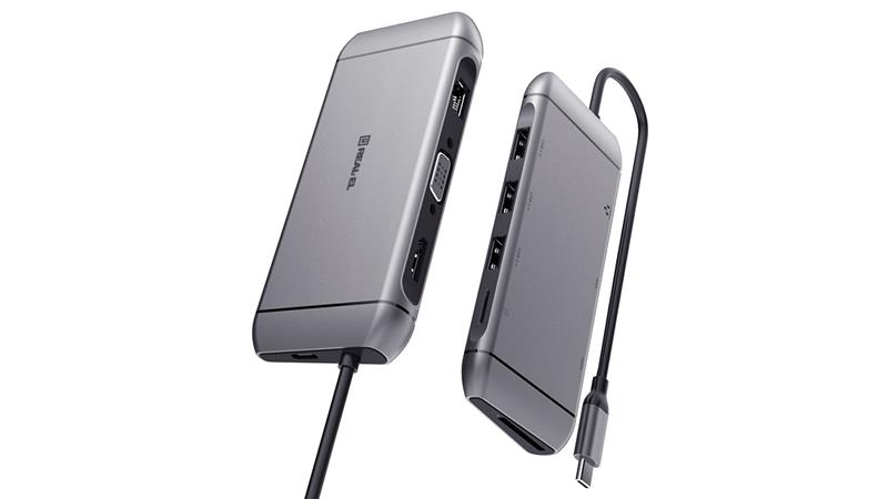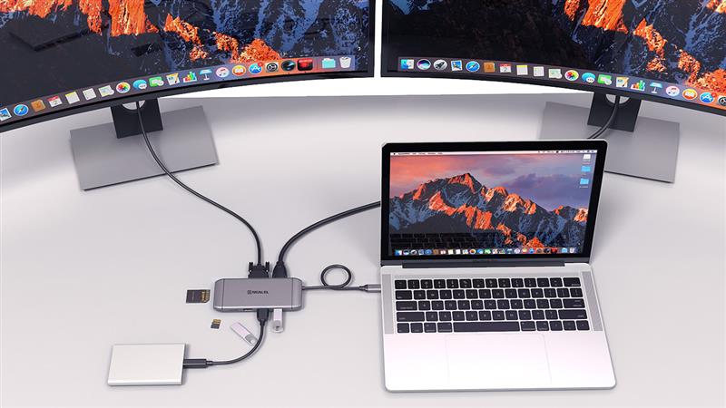 REAL-EL CQ-900 Type C мультифункціональна док-станція призначена для використання з усіма пристроями, що мають можливість підключення за допомогою порту Type C та підтримують всі необхідні протоколи передачі даних. Працює зі смартфонами, планшетами, ноутбуками, які мають підтримку інтерфейсу Type C Одночасне відтворення відео сигналу через порти VGA і HDMI з роздільною здатністю 1920x1080 @ 60Hz Type C Power Delivery потужність живлення до 100 Вт Підтримує Wake-on-LAN Високошвидкісний порт Ethernet стабільного підключення SD / TF карти з високою швидкістю читання та запису