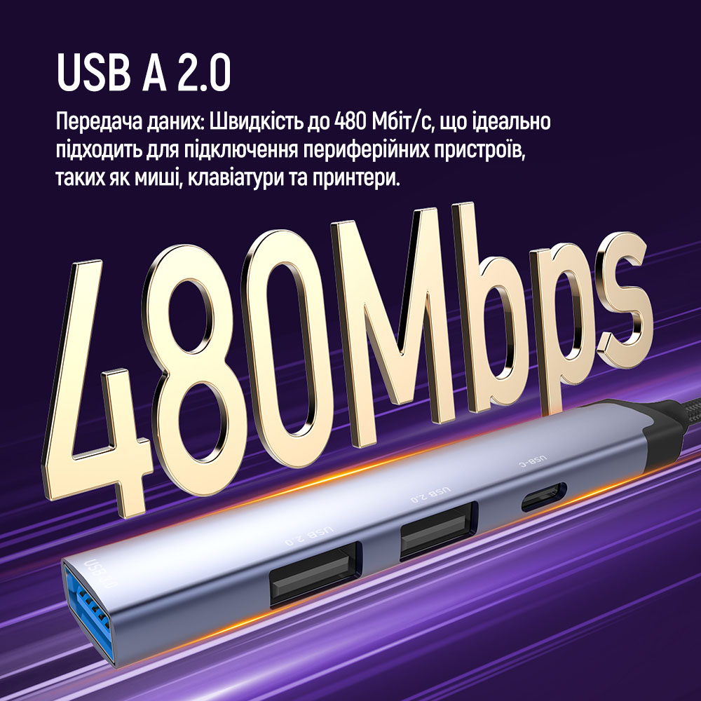 Високошвидкісна передача даних: USB A 3.0 – швидкість передачі до 5 Гб/с., USB A 2.0 – передача даних до 480 Мбіт/с., USB Type-C 2.0 – передача даних до 480 Мбіт/с.