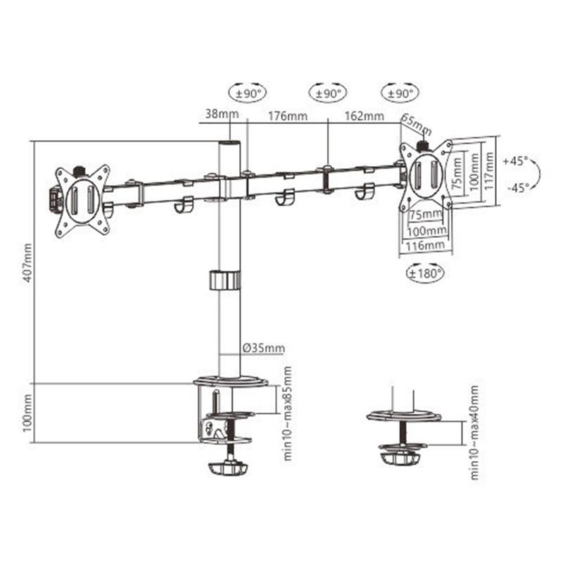 Особливості Настільний кронштейн для монітора з двома кріпленнями Кронштейн дозволяє повертати, висувати, втягувати або нахиляти дисплей, а також дозволяє повертати дисплей з альбомного розташування до портретного тощо. Працює практично з будь-яким РК-монітором (макс. 32 дюйми) Міцний затискач для легкої та надійної фіксації на столі Вбудована система кабельменеджменту для організованого та акуратного робочого простору Сумісність з VESA (100 x 100 мм та 75 x 75 мм)
