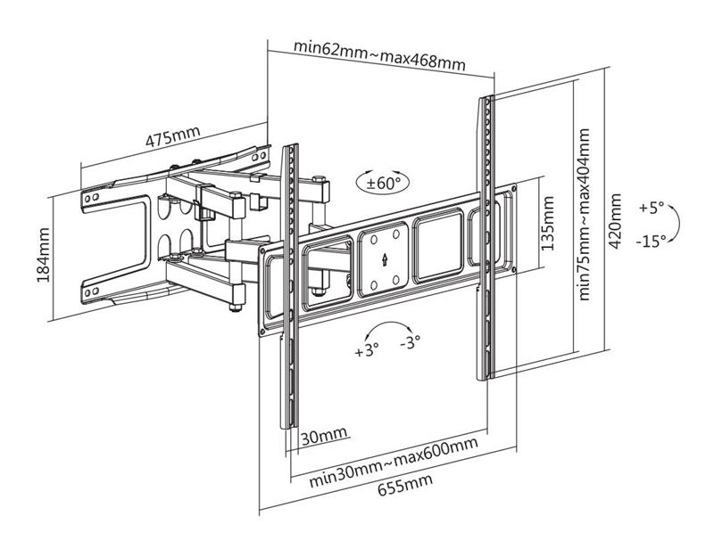 Модель кронштейна Satelit 32-70PIVOT400A дозволяє розміщувати екран на регульованій відстані від стіни від 62 до 468 мм.