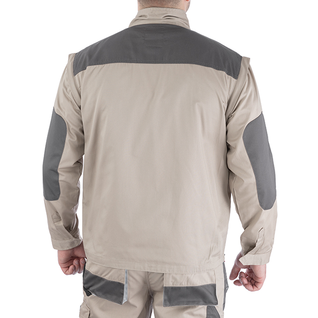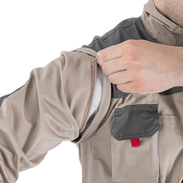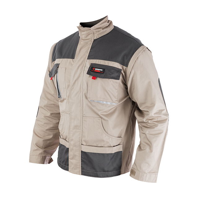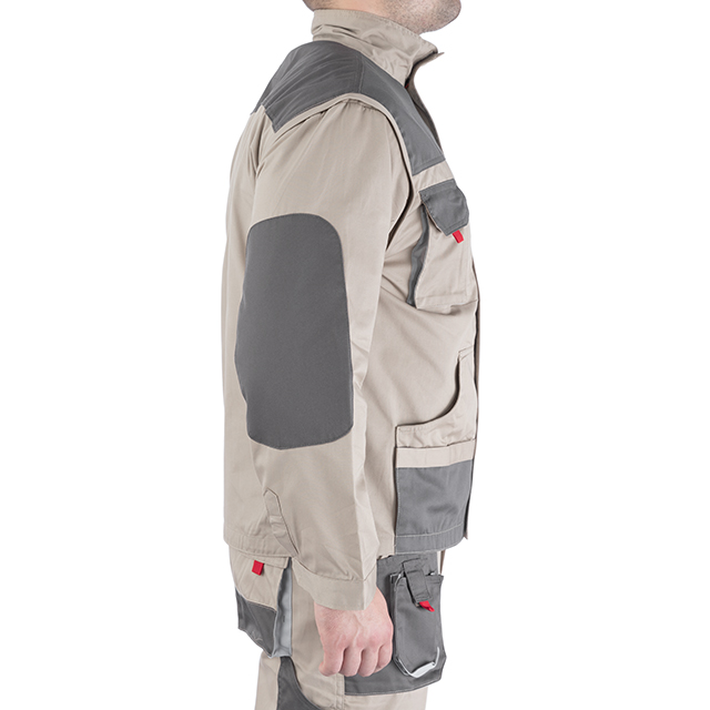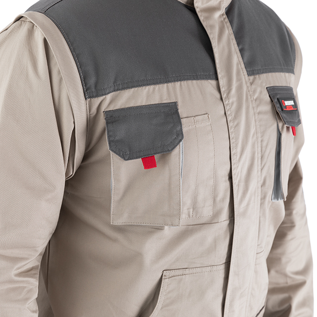 Куртка бежевого кольору виготовляється зі 100% натуральної бавовни з високим рівнем гігієнічності і міцності (щільність 180 г/м²). Виріб відмінно пропускає повітря і не створює дискомфорту під час інтенсивної роботи, при цьому захищає від всіляких механічних впливів зовнішнього середовища. За необхідності, у спекотному середовищі може трансформуватися в робочий жилет, рукави від'єднуються.