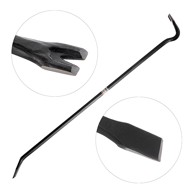 Виготовлений із надміцної загартованої інструментальної сталі для виконання складних демонтажних робіт. Кутовий цвяходер створює опору з високим важелем для зачеплення або підйому, а загострений кінець лома вклинюється у важкодоступні місця. Плоска поверхня цвяходера дозволяє вбивати лом за допомогою молотка.