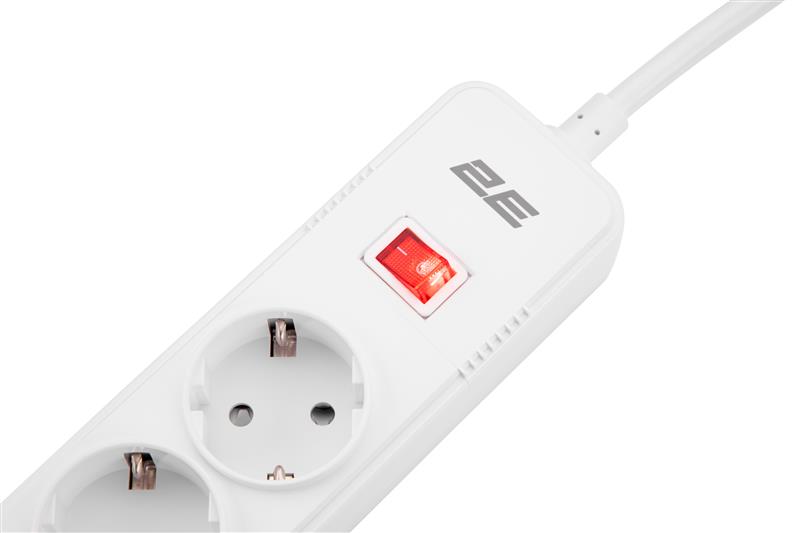 Мережевий фільтр 2E має п’ять розеток, розташованих під кутом 45°, щоби вилки пристроїв не заважали одна одній. Для заряджання мобільних пристроїв передбачено три розніми USB-A: 2 x 5 В, 3,4 A; 1 x 5 В, 2,4 A. Корпус виготовлений з вогнетривкого PC-пластику, що забезпечує високу термостійкість та запобігає виникненню пожежі. У кабелі мережевого фільтра ізольована кожна жила: трижильний H05VV-F із перерізом 1,5 мм. Матеріал провідника – 100 % мідь. Саме ці особливості зумовлюють допустиме максимальне навантаження на пристрій 3 680 Вт. Максимальна поглинаюча енергія фільтра становить 350 Дж.