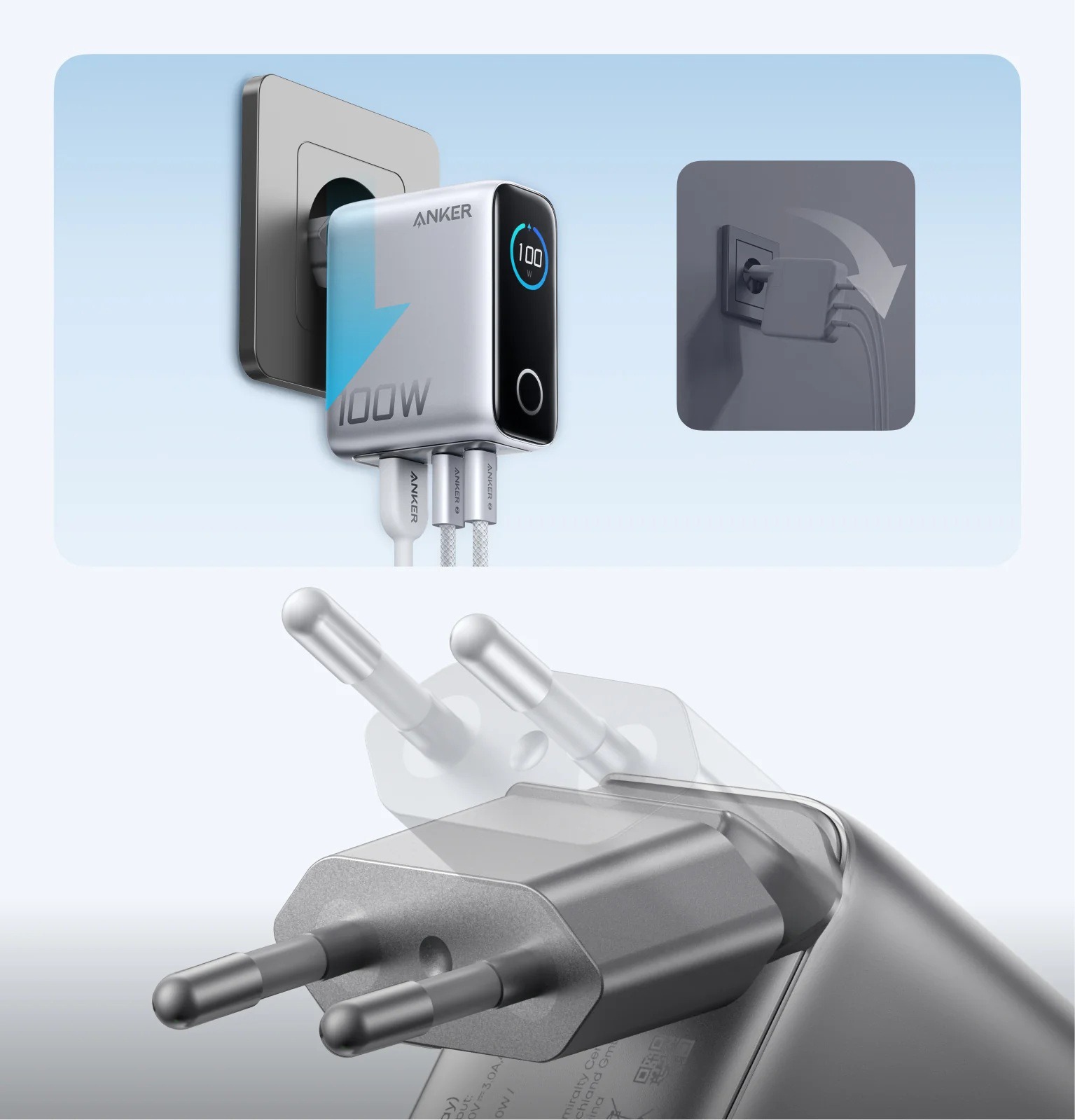 Мережевий зарядний пристрій Anker GaN Charger 100W, 2xUSB-C, 1xUSB-A, Display Silver (B121BG41) + кабель USB Type-C