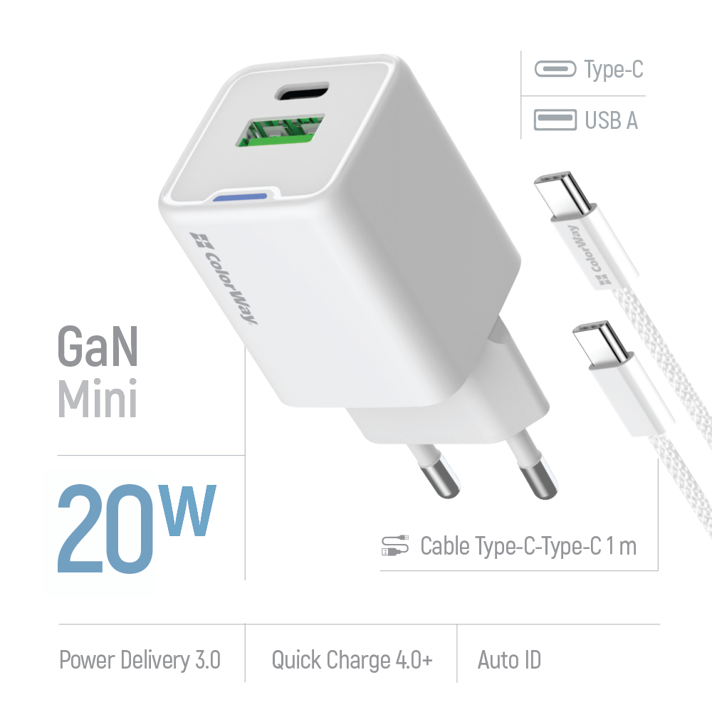 Мережевий зарядний пристрій ColorWay GaN Mini 20W PD Port PPS USB (Type-C PD + USB QC4.0) White (CW-CHS062PDC-WT) + кабель Type-C
