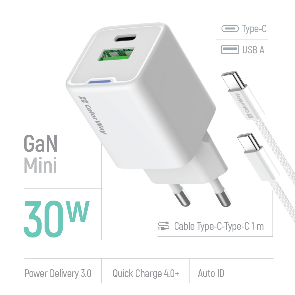 Мережевий зарядний пристрій ColorWay GaN Mini 30W PD Port PPS USB (Type-C PD + USB QC4.0) White (CW-CHS053PDC-WT) + кабель USB Type-C