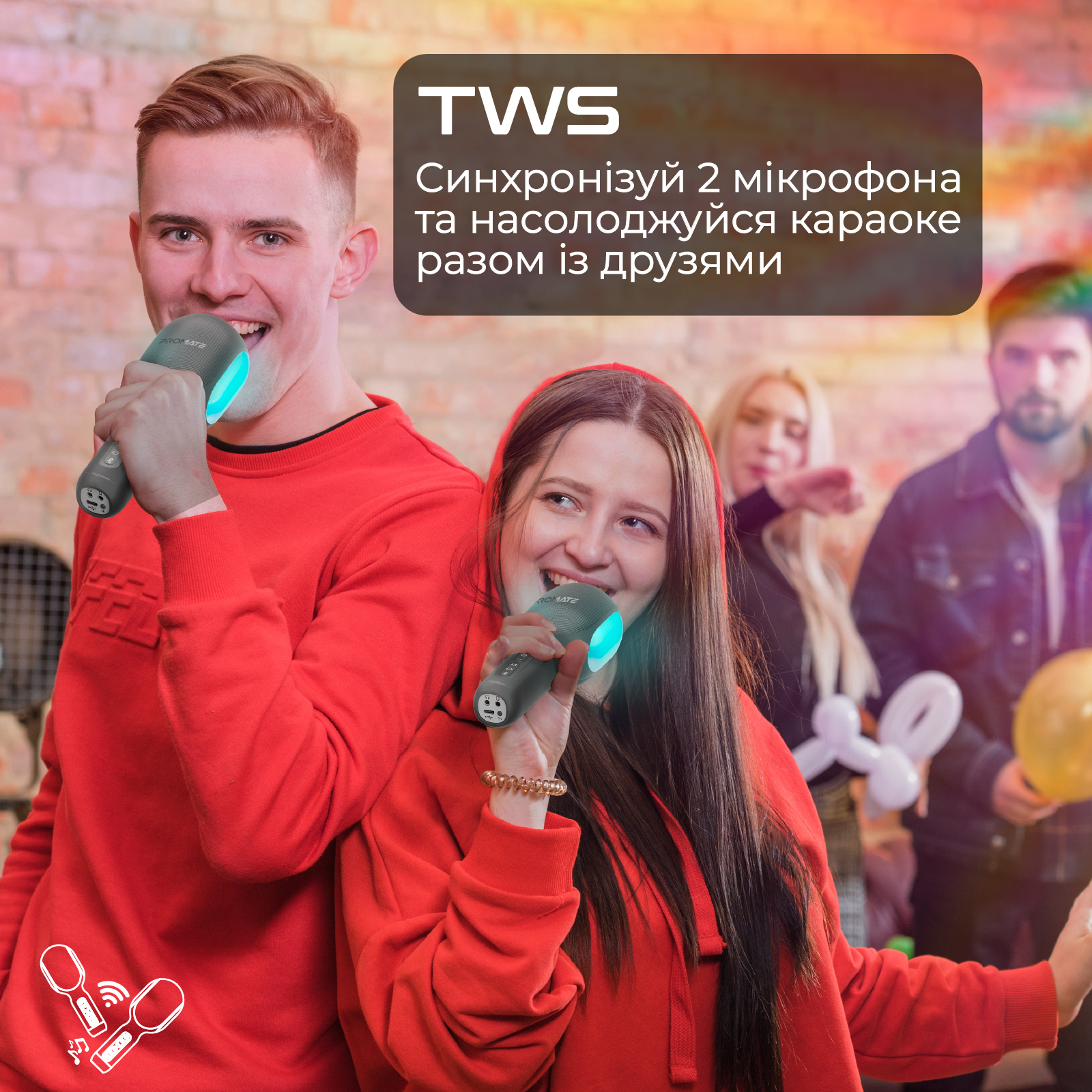 - Функція TWS (True Wireless Stereo): Підключай одночасно 2 мікрофони до одного пристрою та насолоджуйся караоке разом із друзями