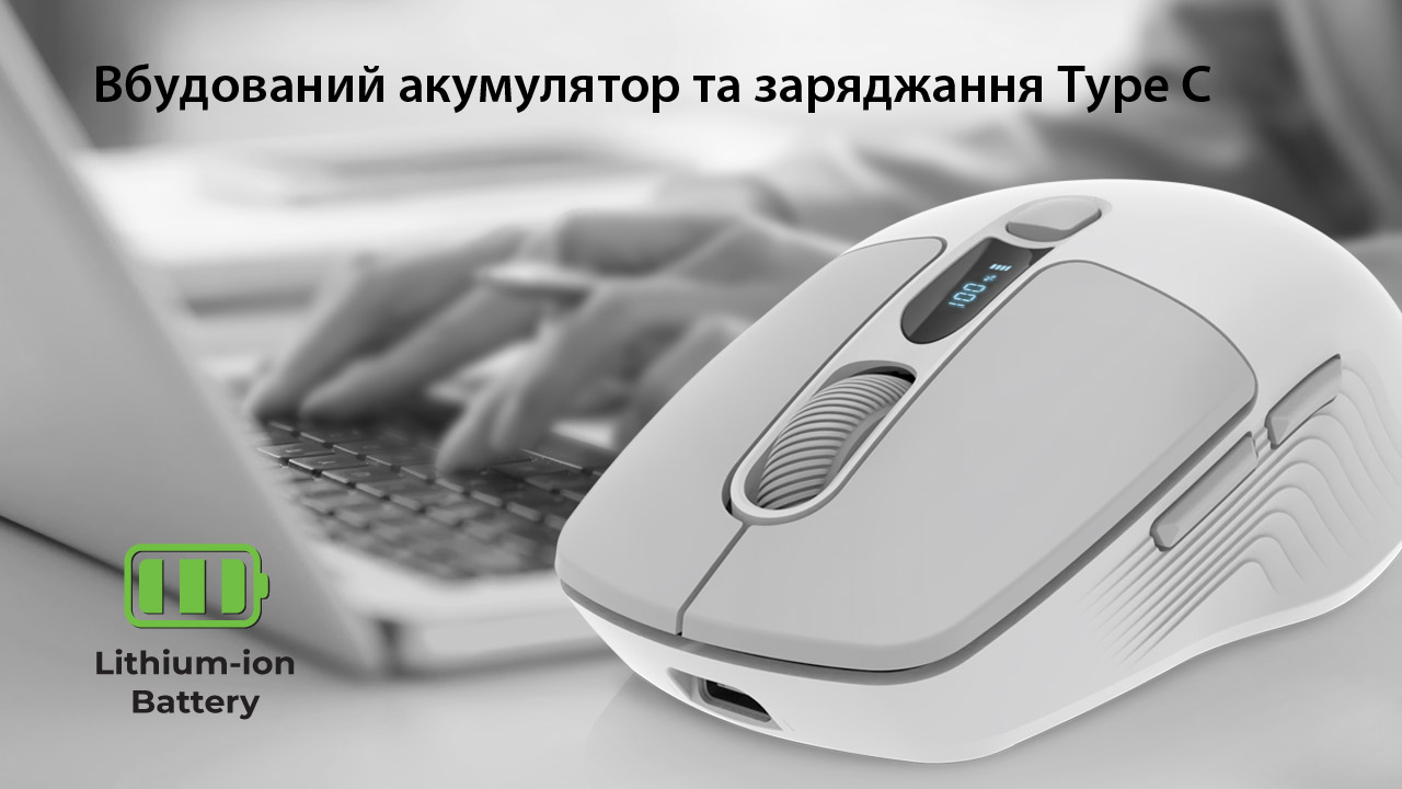Вбудована літієво-іонна акумуляторна батарея ємністю 400 мАч забезпечує тривалу автономну роботу. Заряджання здійснюється через USB Type-C, що дозволяє одночасно користуватися мишкою та заряджати її, забезпечуючи безперервний робочий процес.