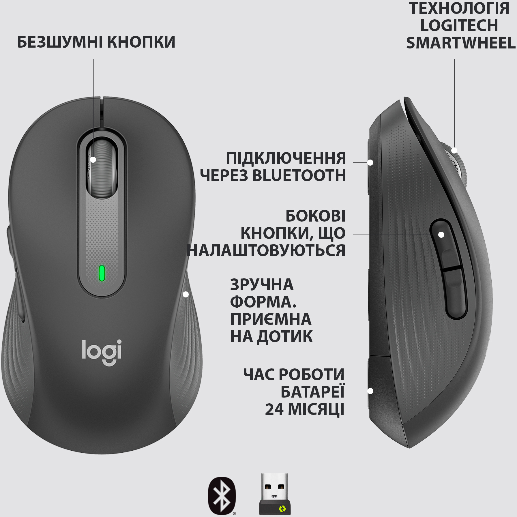 Миттєве приєднання за допомогою технології Bluetooth Low Energy або через USB-приймач Logi Bolt. Надійне та стабільне під’єднання в радіусі до 10 метрів. Миші Signature M650 працюють на безлічі платформ: Windows, MacOS, Linux, iPadOS, Android, а також мають сертифікат Works With Chromebook.