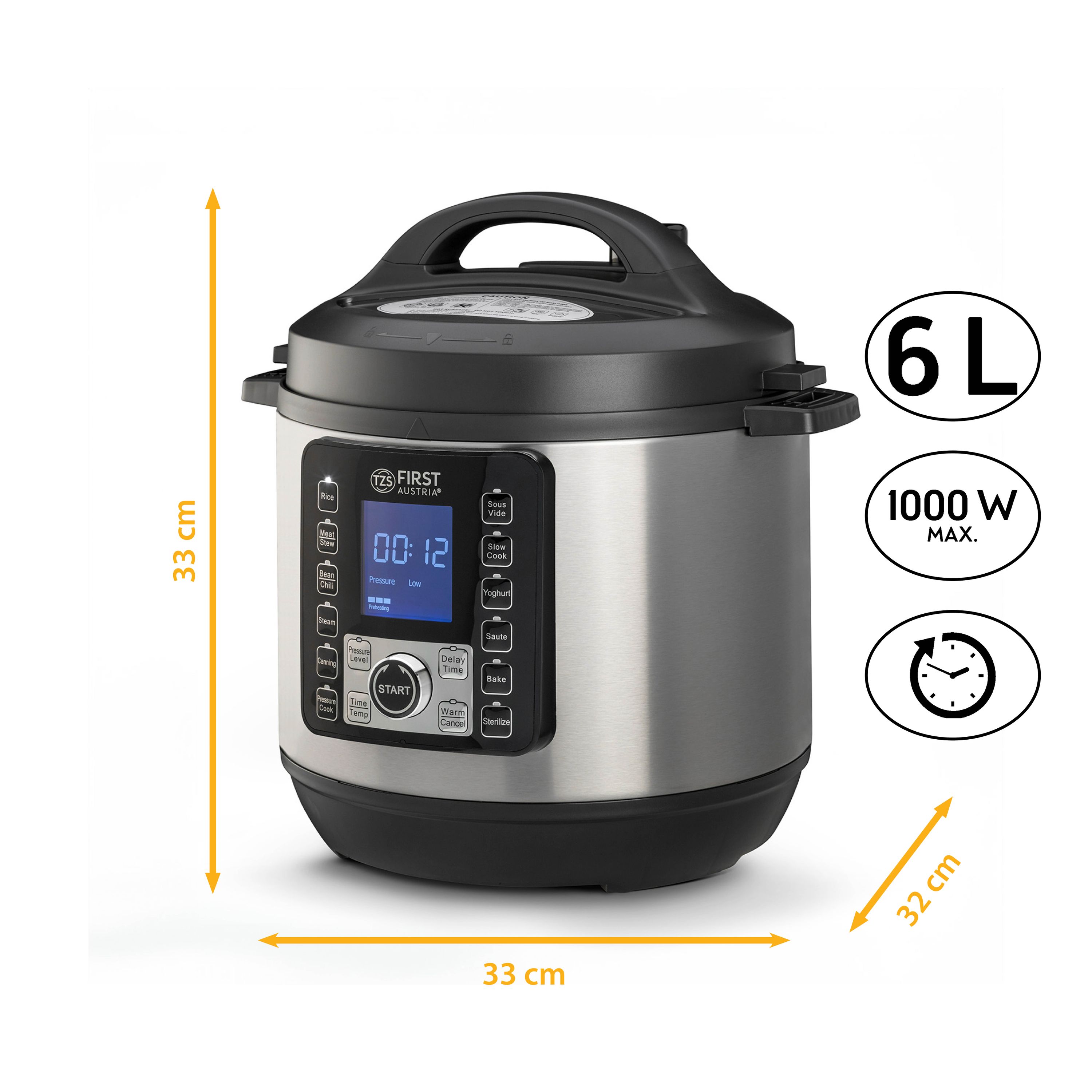 Мультиварка-скороварка First Austria FA-5130-2 являє собою високоякісний пристрій, який забезпечує зручність та багатофункціональність у приготуванні їжі. З потужністю 1000 Вт вона готує страви швидко та ефективно, скорочуючи час приготування. З ємністю 6 літрів ця мультиварка-скороварка ідеально підходить для приготування великих порцій їжі, що особливо зручно для сімейних вечерь та прийомів гостей. Кількість програм становить 12, що дозволяє вибрати оптимальний режим приготування різних видів страв.