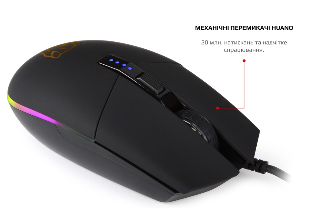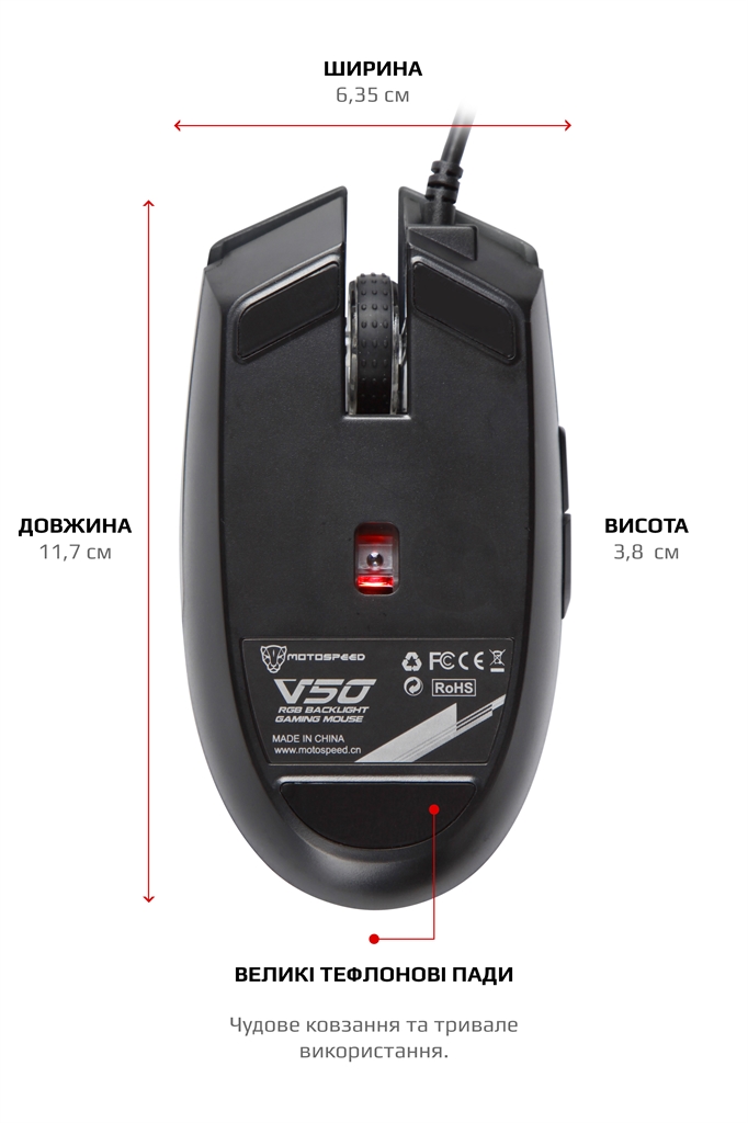 Ідеальна ергономіка та надійність Надійна та потужна миша MOTOSPEED, яка перевершить ваші очікування. Ідеальний ергономічний дизайн гарантує комфортне відчуття і знижує втому. Точне складання та якісний пластик, відсутність люфтів та надмірних зазорів нададуть задоволення від користування. Програмування надає індивідуальність Можливість досконально налаштувати мишу під свої потреби за допомогою програми на ПК – режими підсвічування, частота оновлення порту USB, режими DPI, їх кількість, колір індикації та інше. Макроси – запорука перемоги Налаштування на професійному рівні – запис макросів, комбінацій із затримками, перепризначення кнопок, імпорт та експорт профілів. AVAGO 3050 4к перевірена часом Справжній ігровий сенсор компанії Pixart, точна зброя твоїх майбутніх перемог. Без лагів та помилок, впевнено та надійно. Висока роздільна здатність до 4000 DPI Механічні мікроперемикачі Huano одного з лідерів ринку, надають повний контроль над дією та надшвидке спрацьовування. Надійність, довговічність та точність повторення зусилля натискання один до одного від партії до партії. Чітке та тактильно приємне натискання кнопок без люфтів та надмірних зазорів. RGB Яскраве та ефектне повнокольорове підсвічування RGB, 16800000, з можливістю зміни режимів, занурить вас в атмосферу гри. Реалізовано індикацію вибраного режиму DPI на шкалі. Тефлонові пади та кабель із застібкою Товстий тефлон великої площі забезпечить чудове ковзання та тривале використання. М'який та гнучкий високоякісний кабель, гарантує довговічність та зручність використання, а застібка допоможе організувати кабелі на робочому столі та у подорожі.