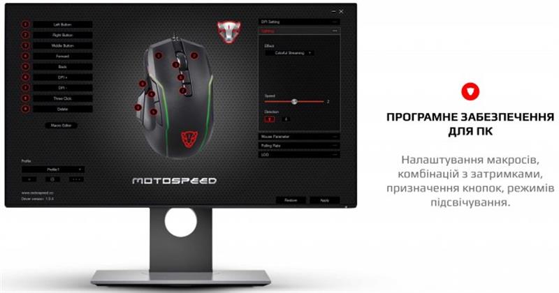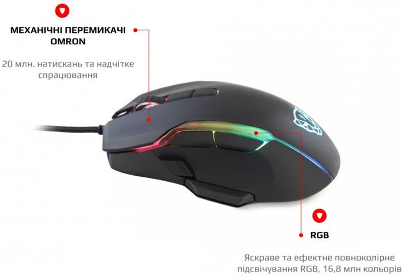Неймовірно зручна та потужна миша Motospeed стане незамінною складовою твоєї перемоги. Ідеальний дизайн, який гарантує комфортні відчуття та знижує втому. Точне складання та якісний пластик, відсутність люфтів та надмірних зазорів подарують задоволення від користування. Механічні мікроперемикачі OMRON Неперевершена легендарна Японська якість. Перемикачі дають повний контроль над дією та надшвидке спрацьовування. Надійність, довговічність та точність повторення зусилля натискання, один до одного, від партії до партії. Чітке та тактильно приємне натискання кнопок без люфтів. RGB Яскраве та ефектне повнокольорове підсвічування RGB з 16.8 млн. кольорів занурить вас в атмосферу гри. Тефлонові ніжки та кабель із застібкою Товстий тефлон великої площі забезпечить чудове ковзання та тривале використання. М'який та гнучкий високоякісний кабель гарантує довговічність та зручність використання, а застібка допоможе організувати кабелі на робочому столі та у подорожі.