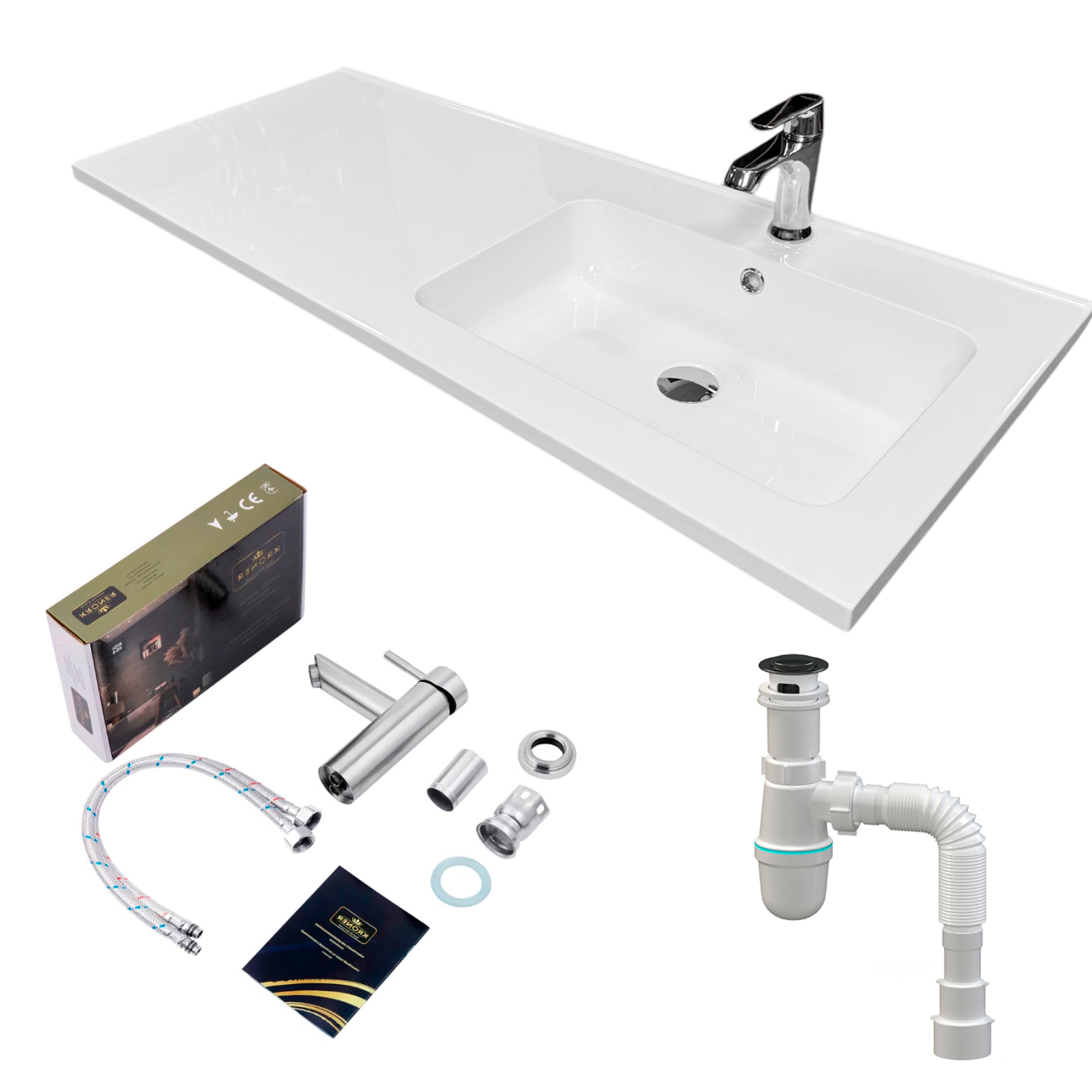 Набір для ванної кімнати, раковина, умивальник Adamant FLATE 120R, штучний камінь, прямокут., з сифоном Click-Clack + змішувач