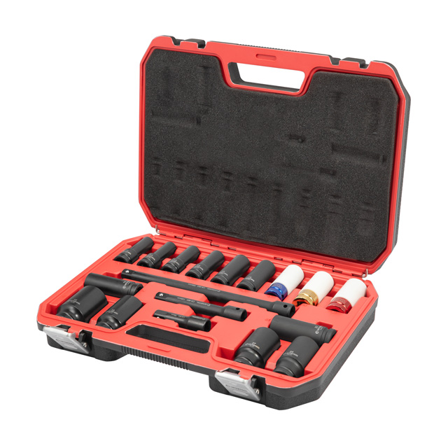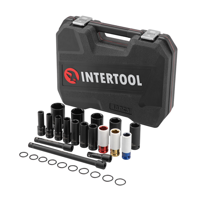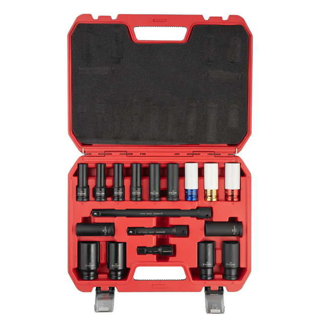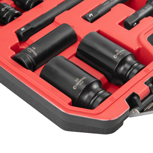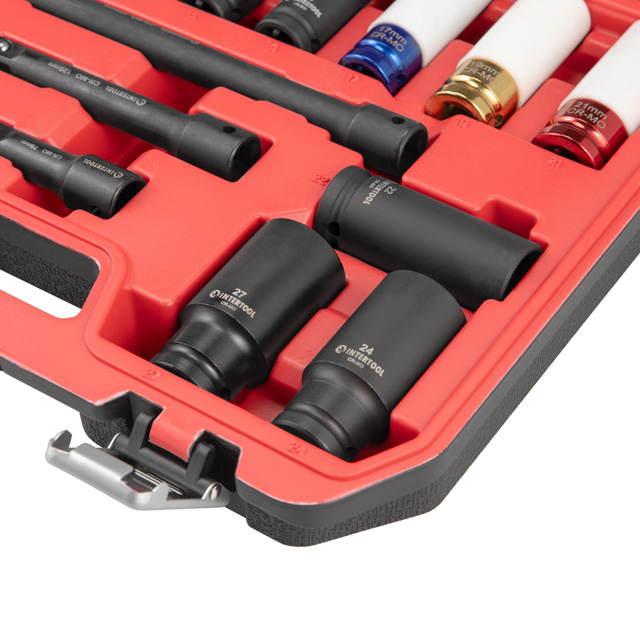 Набір ударних головок та подовжувачів використовується для монтажу та демонтажу різних шестигранних різьбових з'єднань. Працюють у парі з ударними пневмо- та електрогайковертами, гвинтовертами з квадратом 1/2". У комплекті головки, розміром 10, 11, 12, 14, 15, 16, 17, 18, 19, 21, 22, 23, 27. 1/2", 75, 125, 250 мм.