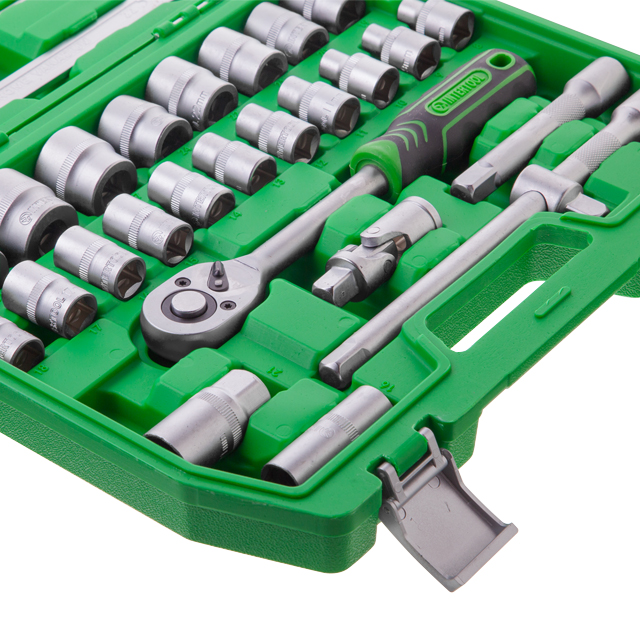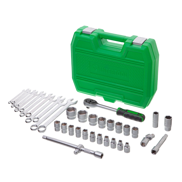 Набір з комплектацією на 38 одиниць включає тріскачку з посадковим квадратом 1/2", набір шестигранних головок від 8 до 32 мм, вони підходять для виконання різнопланових робіт на закручування та відкручування кріплень.