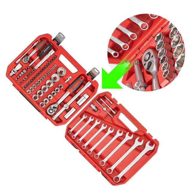 Кейс набору зазнав трансформації, виготовлений з якісного міцного пластику, який витримує інтенсивну експлуатацію та захищає інструменти при транспортуванні.