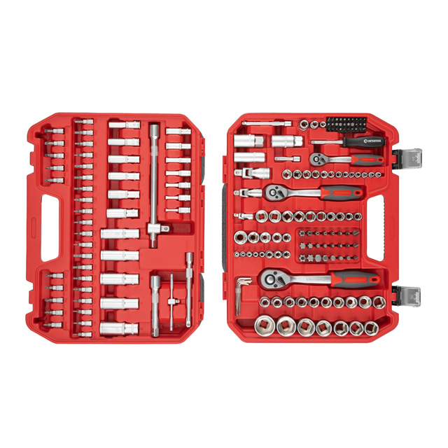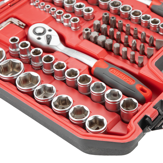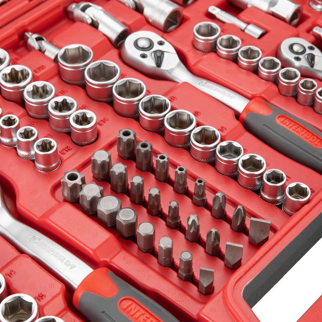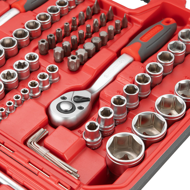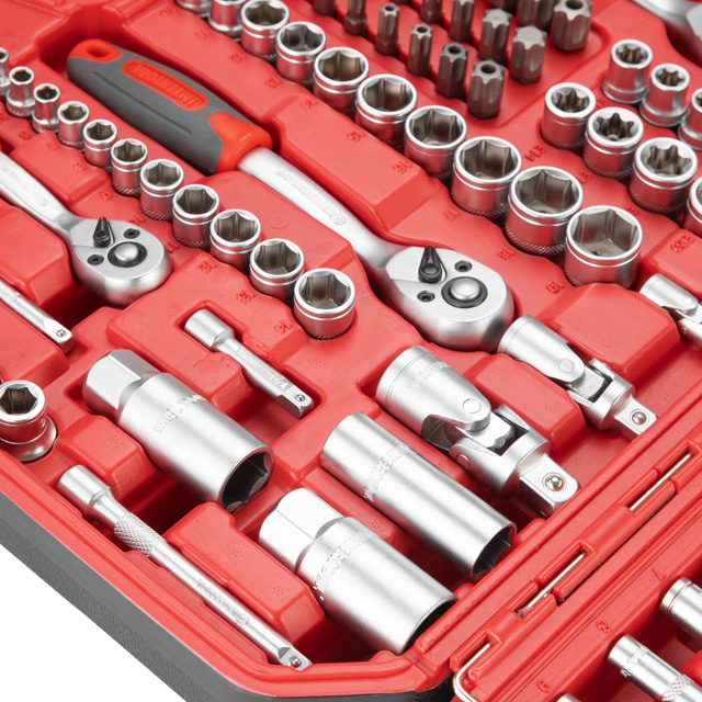 Набір інструментів має широкий асортимент, в комплект входять три тріскачки з посадковими квадратами: 1/2", 3/8", 1/4", а також шестигранні головки розміром від 4 до 32 мм. У комплект входять головки E-типу з діапазоном розмірів від E4 до E20 мм, що дозволяє працювати з кріпленнями з профілем "зірка", який часто зустрічається в сучасних автомобілях. Подовжені головки від 4 до 22 мм для роботи з високими шпильками та у важкодоступних місцях.