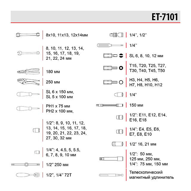 У комплекті додані головки E-типу з розмірним рядом від E4 до E18, для роботи з кріпленнями з типом профілю "зірочка", які часто зустрічаються у сучасних автомобілях. Свічні головки на 16, 21 мм дозволяють викрутити свічку запалювання в будь-якому автомобілі та мототехніці.