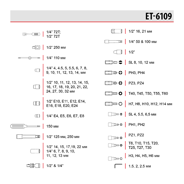 У набір включені головки E-типу з розмірним рядом E4-E24 для кріплення з профілем "зірочка". Подовжені головки від 6 до 22 мм, подовжувачі та кардани для роботи з високими шпильками гвинтів, а також для зручної роботи в обмеженому просторі.