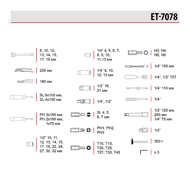 Основою комплекту є дві тріскачки з приводом 1/2" та 1/4", шестигранні головки для виконання різнопланових робіт на закручування та відкручування кріплень. А наявність подовжувачів, воротків та карданів полегшать роботу у важкодоступних місцях.