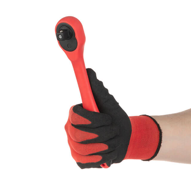 Невеликий вигин руків'я збільшує комфорт у роботі з незручно розташованими кріпленнями. Тріскачка повністю вкрита захисним шаром поліпропілену з гумовими вставками на ручці для міцної фіксації інструмента в руці.