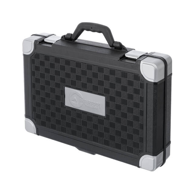 Кейс виготовляється з міцного пластику з металевими замками. Всі інструменти щільно зафіксовані на своїх посадкових місцях з маркуванням розміру головок. Наявність поролонового прошарку не дозволяє висипатися вмісту набору під час транспортування.