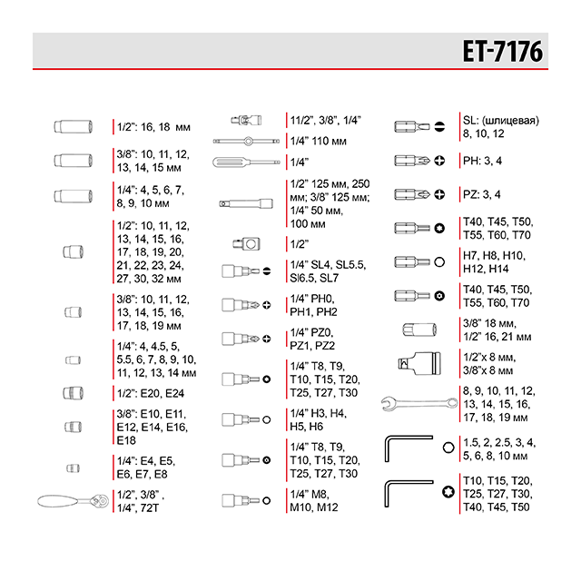 - Головки Е-тип (Torx) підходять для спеціальних видів болтів та гайок, можуть застосовуватись під час ремонту двигуна та ходової автомобіля, E4 – E24.