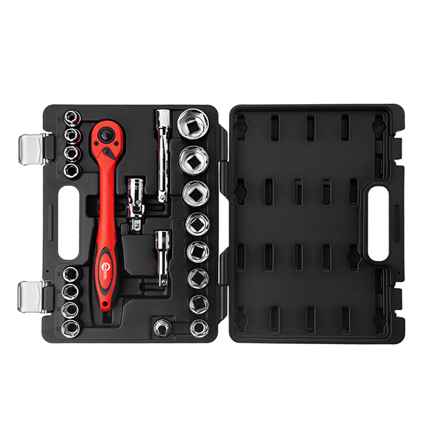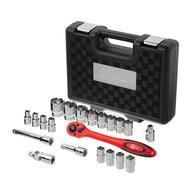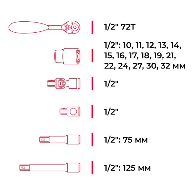 Основою комплекту є тріскачка з приводом 1/2", шестигранні головки для виконання різнопланових робіт на закручування та відкручування кріплень. Наявність подовжувача, воротка та кардана полегшить роботу у важкодоступних місцях.