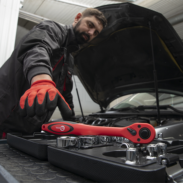 Механізм тріскачки має плавний хід у 72 зубці, відрізняється високою точністю та зносостійкістю. Швидке скидання головок та наявність реверсу спростять й прискорять роботу майстра. Вигнута форма ручки для зручної роботи у важкодоступних місцях. Головки надійно фіксуються на посадкових квадратах тріскачок, не спадають й щільно прилягають до поверхні кріплення. Тріскачка повністю вкрита захисним шаром поліпропілену з гумовою накладкою в місці хвата для кращої фіксації в руці, не ковзає й не випадає під час роботи.