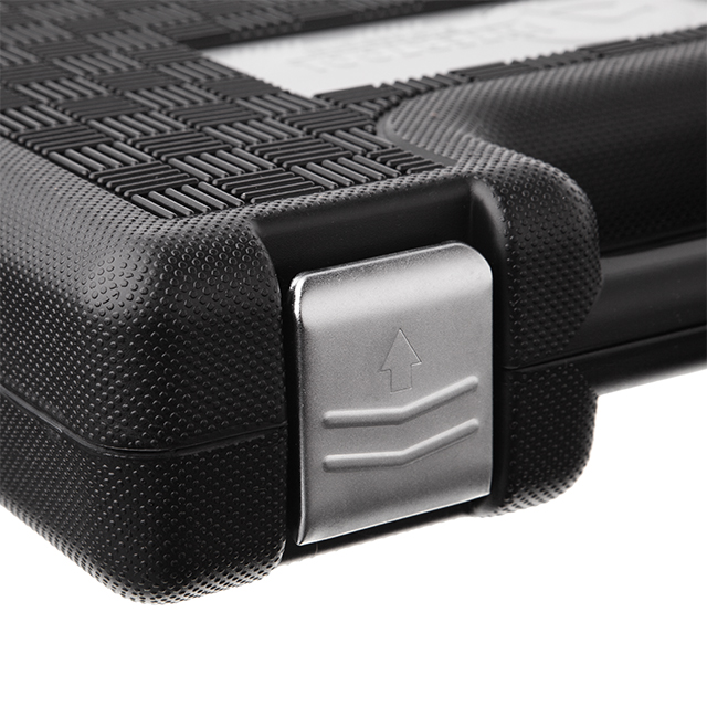 Всі інструменти розміщені в ударостійкому пластиковому кейсі. Комплектуючі щільно зафіксовані на своїх посадкових місцях, а наявність поролонового прошарку не дозволяє висипатися набору при транспортуванні.