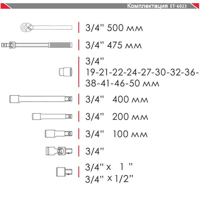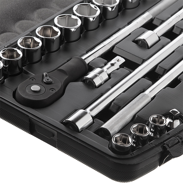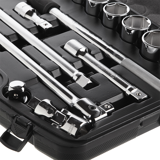 Інструменти цього набору вирізняються великими розмірами та виключно високою якістю, тому забезпечують найкращі умови для докладання зусилля під час роботи із зовнішніми робочими профілями. Набір стане в пригоді для ремонту великогабаритної техніки на зразок вантажівок, оскільки містить 12 торцевих головок великих діаметрів. Крім того, у професійний набір інструменту входять вороток, три подовжувачі, перехідники та кардан для роботи у важкодоступних місцях.