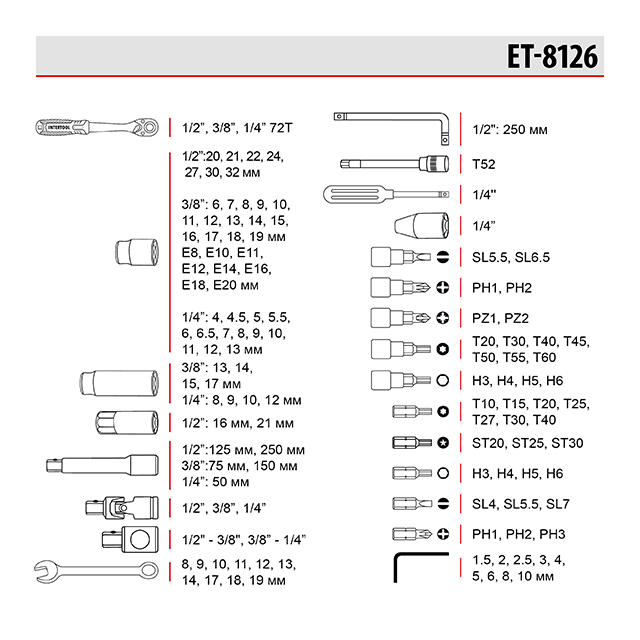 Широка комплектація набору зі 126 одиниць містить в основі три тріскачки, з посадковими квадратами: 1/2", 3/8", 1/4", а також шестигранні головки, розміром від 4 до 32 мм.