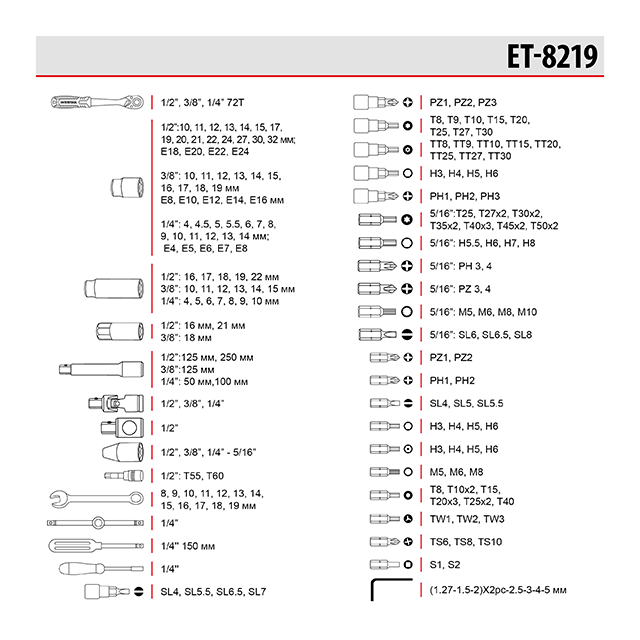 Даний набір вигідно вирізняється своєю широкою комплектацією на 219 одиниць. В основі набору три тріскачки з посадковими квадратами: 1/2", 3/8", 1/4". Також до набору увійшли: