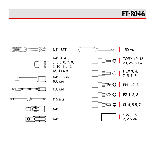 Комплектація набору з посадковим квадратом 1/4” знадобиться для виконання більшості робіт, пов’язаних з ремонтом обладнання, авто-, мото-, велотехніки, а також інших робіт у побуті та в гаражі кожного майстра.