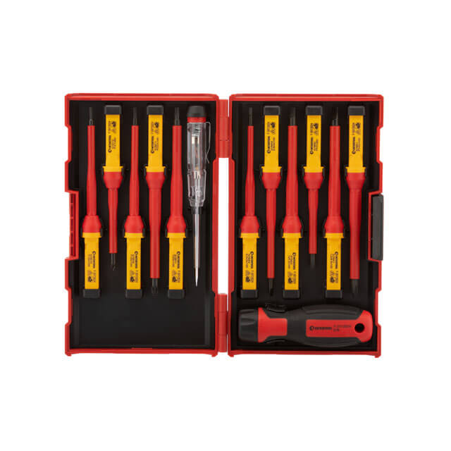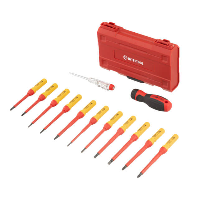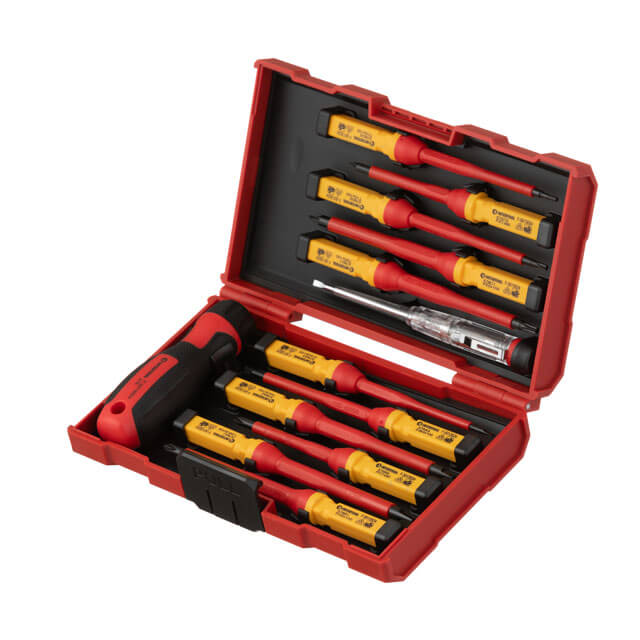 Набір діелектричних викруток призначений для електромонтажних робіт, які виконують під напругою до 1000 В. Використовується для безпечної та зручної роботи з електромережами, запобіжниками, перемикачами та різними приладами.