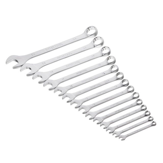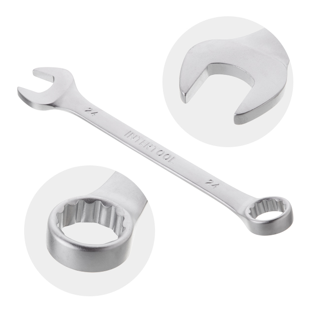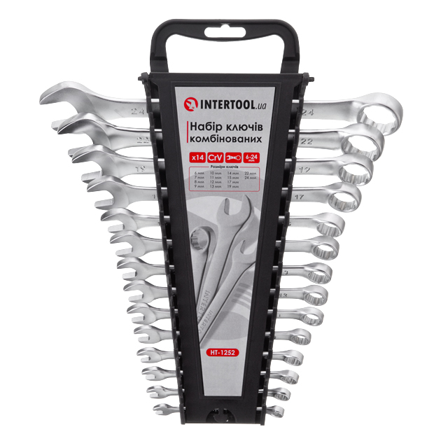 У набір INTERTOOL HT-1252 увійшли ріжково-накидні ключі, розмірами: 6; 7; 8; 9; 10; 11; 12; 13; 14; 15; 17; 19; 22; 24 мм. Це дозволяє обрати необхідний розмір під будь-які завдання для монтажу та демонтажу різьбових з'єднань гайок та болтів.