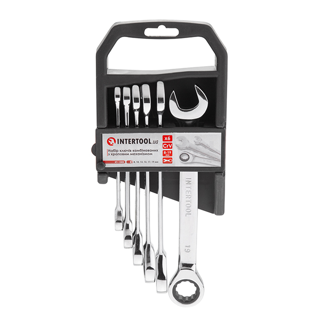 Набір ріжково-накидних ключів з тріскачкою INTERTOOL XT-1302 містить найпопулярніші розміри: 8, 10, 13, 15, 17, 19 мм, що дозволяє підібрати необхідний ключ під будь-які завдання для монтажу і демонтажу різьбових з'єднань гайок і болтів.