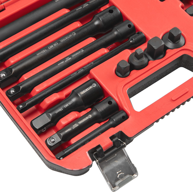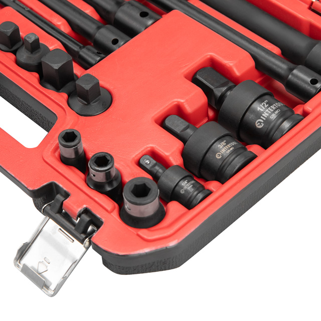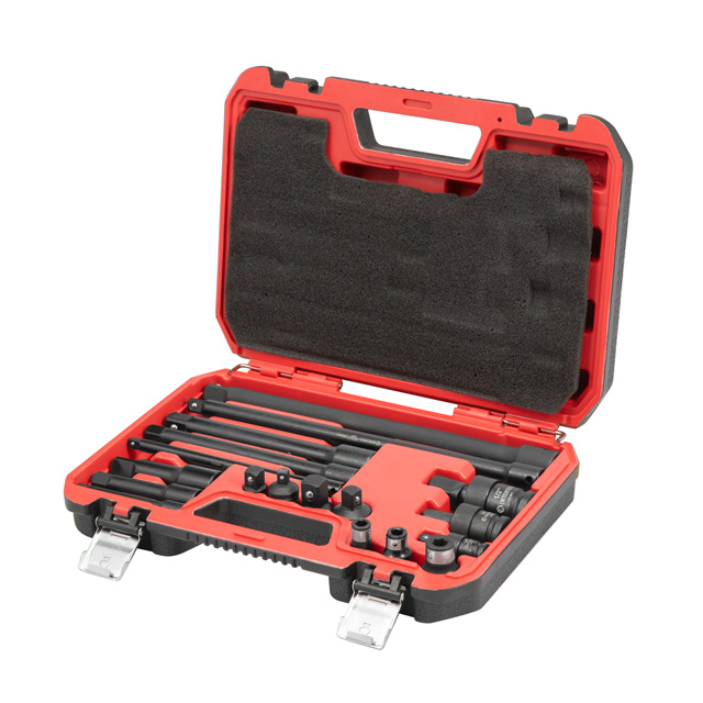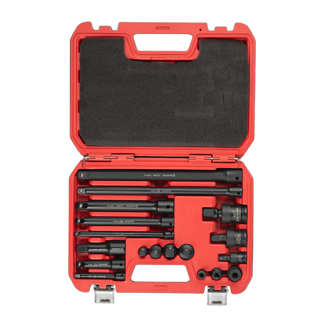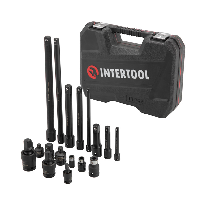 Набір ударних перехідників та подовжувачів використовується при монтажі та демонтажі різних шестигранних різьбових з'єднань. Працює в парі з ударними головками та пневмо- та електрогайковертами, гвинтовертами з квадратом 1/2", 1/4", 3/8". У комплекті 10 перехідників та 8 подовжувачів, що дозволяє працювати з будь-якими насадками та інструментами, забезпечує максимальну універсальність у роботі.