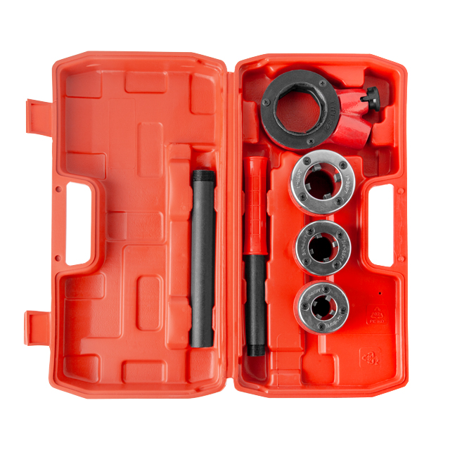 Набір складається з трьох плашок під труби діаметром 1/2″, 3/4″, 1”, тримача для насадок з ручкою. Плашка-тримач з храповим механізмом дозволяє встановлювати плашки з обох сторін, таким чином нарізати різьбу в потрібному напрямку. Плашка надійно фіксується в тримачі завдяки спеціальній формі профілю. Ручка з подовжувачем служить важелем та дає змогу ефективно працювати з інструментом.