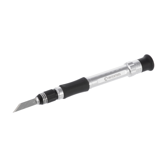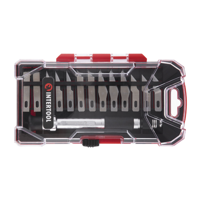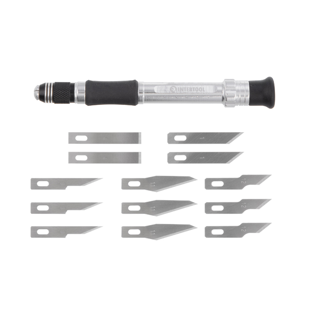 Завдяки наявності 13 різних форм лез можна виконувати різноманітні завдання без відриву від робочого процесу: все зручно розміщено в одному кейсі. Ручка-тримач має гумову накладку в місці хвату, що забезпечує кращу фіксацію в руці. Наявність поворотного ковпачка з поглибленням під палець для більшого комфорту та ефективної роботи.