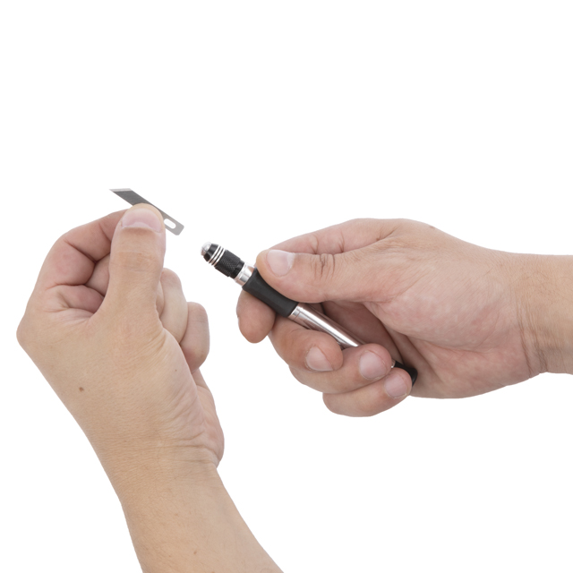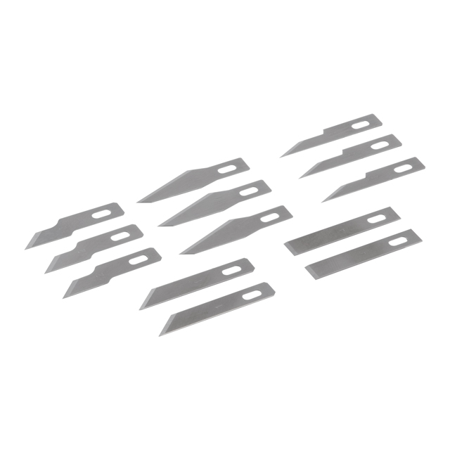 Макетні леза виготовлені з міцної сталі T10 з великою твердістю HRC60. Це забезпечує високу гостроту та тривале заточування лез. Тримач виконаний у вигляді кулькової ручки та має легкий, зручний корпус із алюмінію. Кейс із тримачами під кожен елемент виготовлений з міцного пластику із прозорою кришкою.