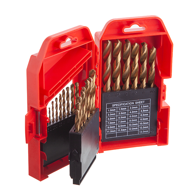 У наборі 25 свердел: 1, 1.5, 2, 2.5, 3, 3.5, 4, 4.5, 5, 5.5, 6, 6.5, 7, 7.5, 8, 8.5, 9, 9.5, 10, 10.5, 11, 1, 12,5, 13 мм.