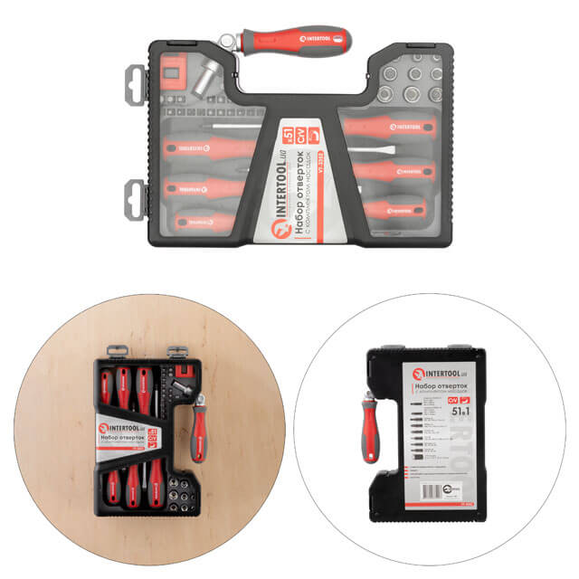 Весь набір розміщено в компактному кейсі (300*200*50 мм), де реверсивна викрутка з карданом виступає в ролі ручки. Це дозволяє економити простір під час зберігання, а також зручно транспортувати комплект. Елементи комплекту завжди лишаються на своїх місцях і не випадають при транспортуванні - набір закривається на дві застібки.