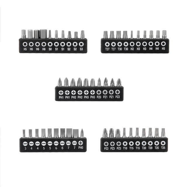 Біти: SL3, SL4х2, SL5х2, SL6х2, SL7х2, PH0, PH1х2, PH2х2, PH3х2, PZ0, PZ1х2, PZ2х2, PZ3х2, T10, T15х2, T20х2, T25х2, T27х2, T30х2, H2, H3х2, H4х2, H5х2, H6х2, H8, S0, S1х2, S2х2, S3х2.