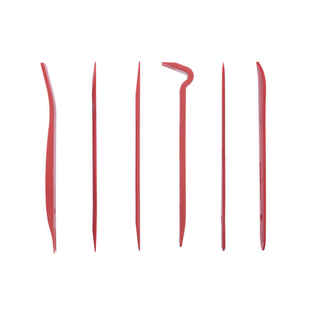 До набору входять 6 предметів різної форми: з круглими, гострими, широкими і вузькими краями, які дозволяють працювати з більшістю панелей обшивки. На знімачах є спеціальні прорізи для демонтажу кліпс кріплення.