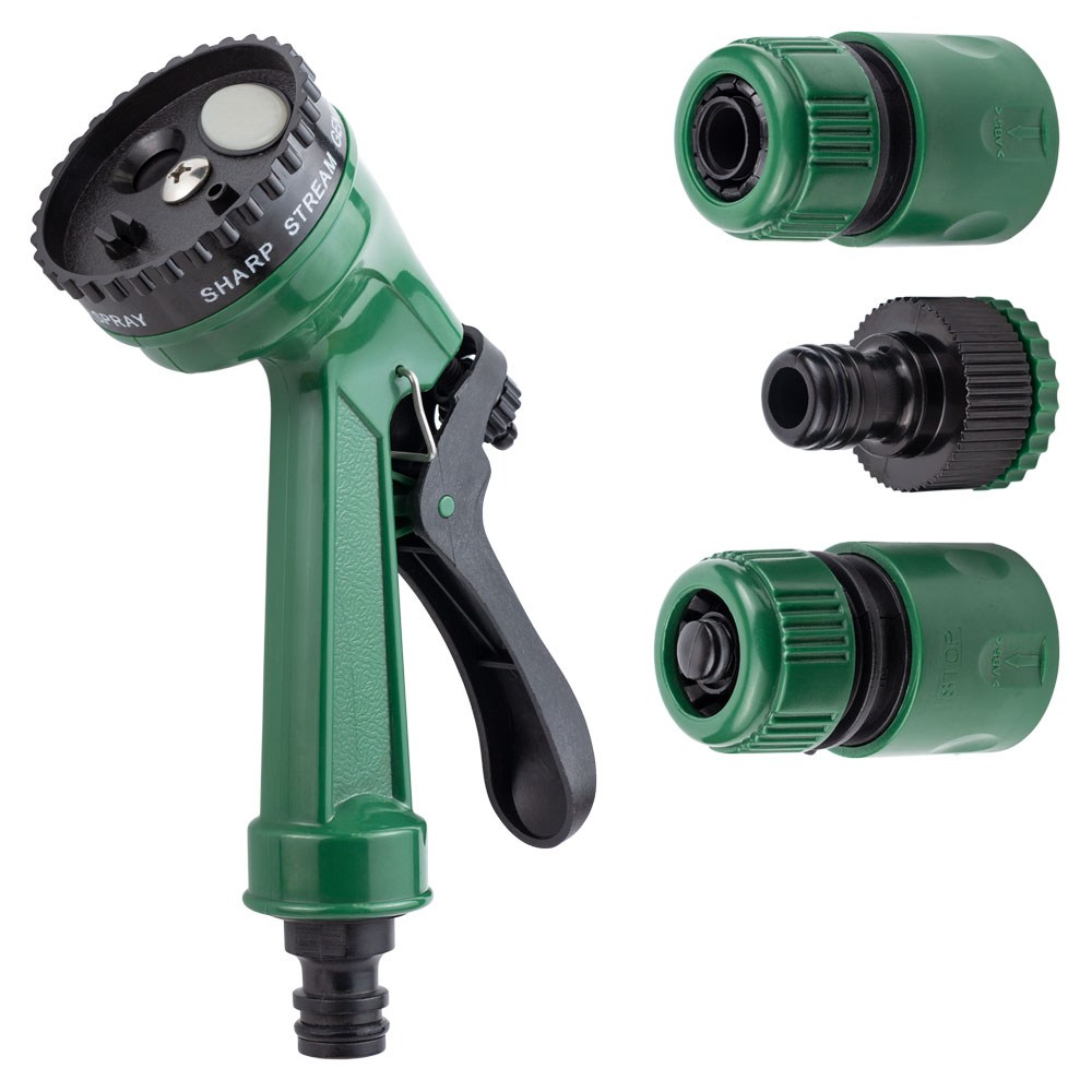 Набір для поливу пістолет розпилювач 4-х режимний 2 конектора+адаптер на шланг ¾" Grad (5012585) призначений для спрямованого поливу присадибних ділянок, городів, клумб, газонів і т. д. крану.